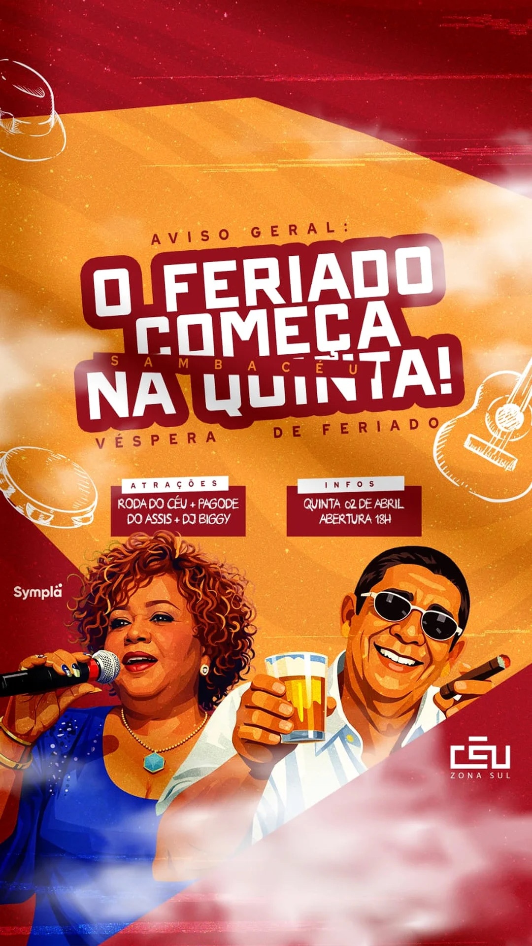 CÉU EM BRASA Churrasco, música e novidade no ar Atrações: Pagode do Bolina DJ Rizzo Promocéus \* Open Chope das 15h às 18h — R$25 \* Churrasco — R$15 \* Churrasco + Open — R$40 (15h às 18h) \* Caipão do Céu e Mojito — R$15 até 20h 15 às 23h Antecipado pelo @sympla ⸻ Reservas e Informações (51) 99806-1487 @rangodoceu Pizza do Céu @blackyellowtattooo