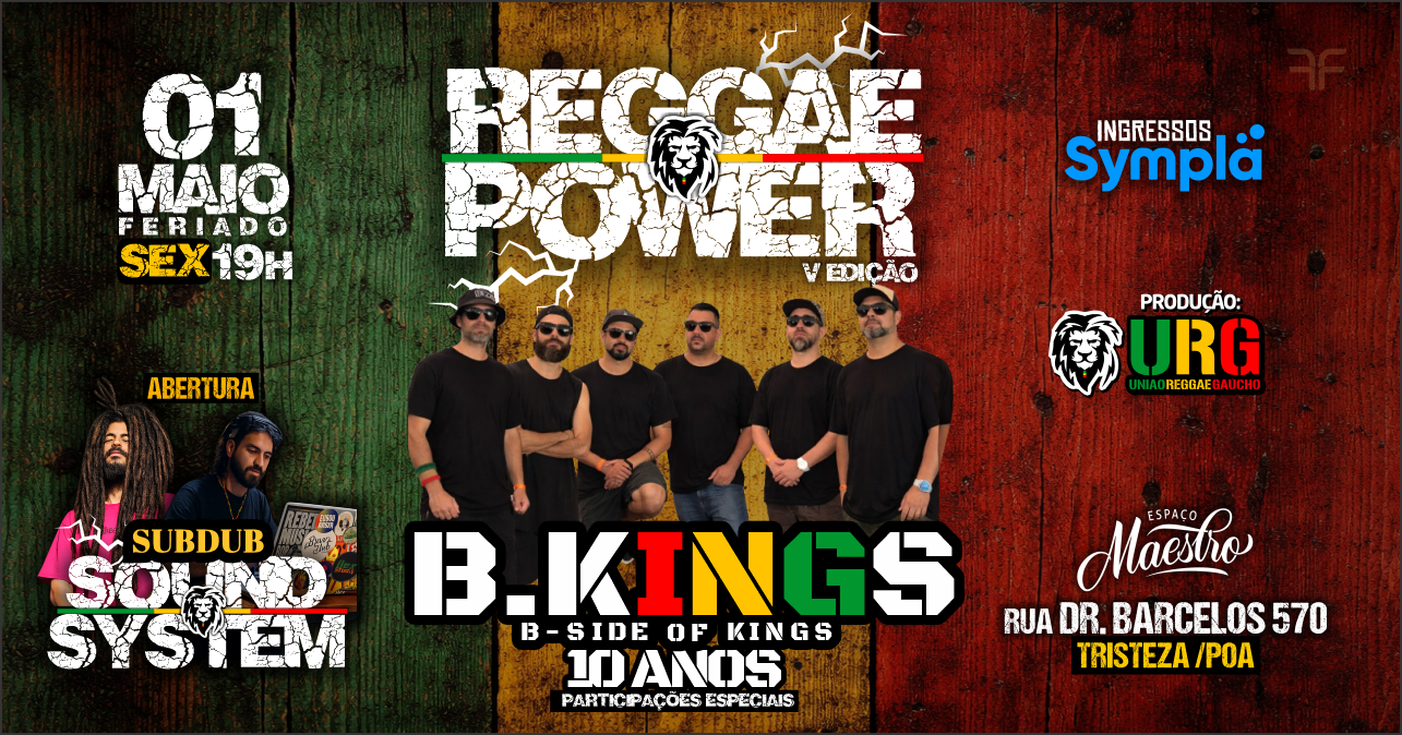 Nesta quinta edição trazemos a banda B-KINGS, nascida na zona sul de Porto Alegre e que este ano completa 10 anos e vamos celebrar juntos no Espaço Maestro trazendo os clássicos do reggae nacional e aquele bloco PESADO dos ROOTS clássicos como Gladiators, Dennis Brown, Steel Pulse, Israel Vibration entre outros. Junto com a B-KINGS teremos convidados especiais como Otto Gomes ex integrante da banda Diretoria e Chimarruts, Ariele Locateli fazendo a voz feminina e o Professor Alex ex integrante da Paz de Jah, trazendo muito reggae music, amizade e harmonia que o reggae traz.