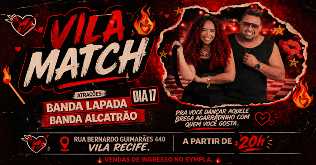 A Vila Match chega com uma proposta envolvente: um evento pensado pra quem curte um bom brega, energia romântica e muita troca de olhares. É o lugar ideal pra ir com amigos ou encontrar alguém especial na pista.
