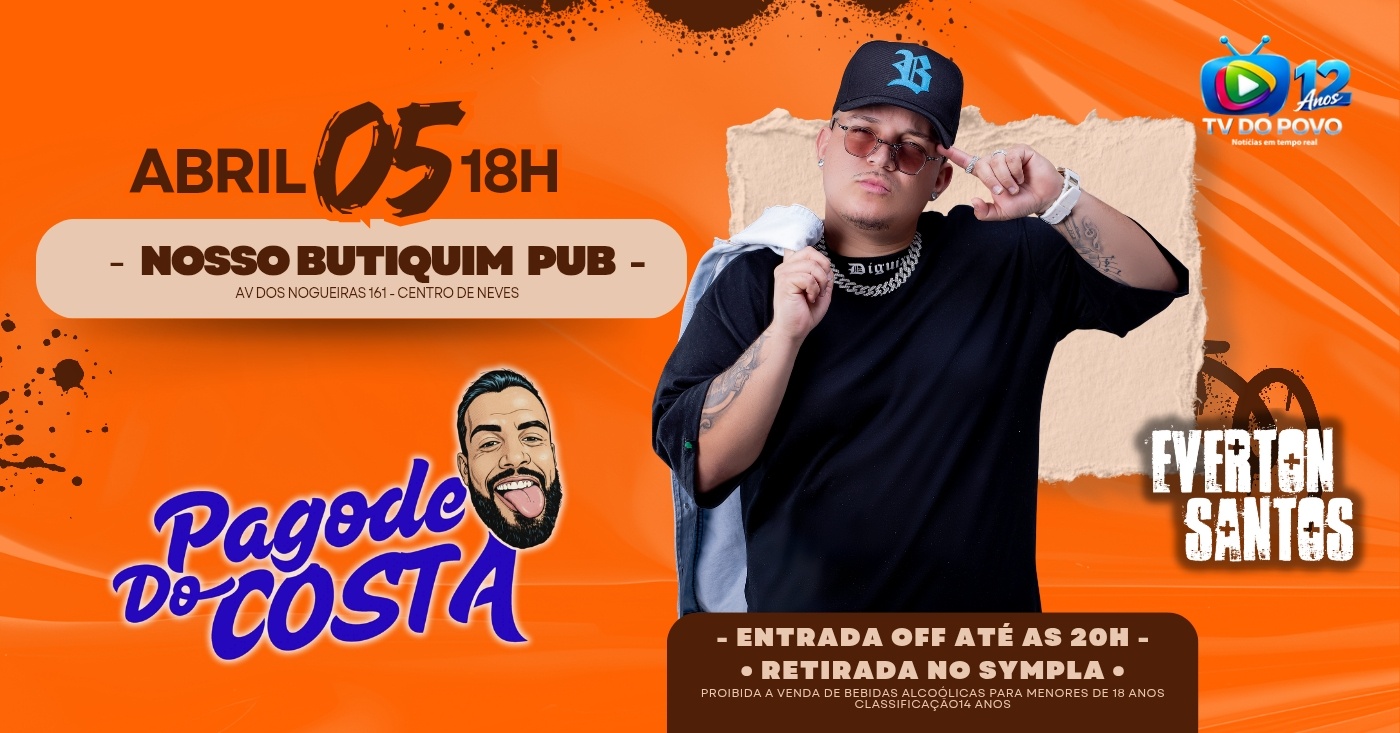 SÁBADO É DIA DE FESTA! 04/04 | 20h às 03h Prepare-se para uma noite inesquecível com muito churrasco, sertanejo, pagode e você! Churrasco fogo de chão liberado Shows com Thaamy Campos e Tiago Rios Entrada OFF unissex até 22h (Garanta retirando pelo Sympla) Chama a galera e vem viver essa experiência! ● PROIBIDO À ENTRADA DE MENORES DE 14 ANOS ● PROIBIDO À VENDA DE BEBIDAS ALCOÓLICAS PARA MENORES DE 18 ANOS ● AO RETIRAR SEU INGRESSO VOCÊ CEDE SEUS DIREITOS DE IMAGEM PARA USO DO EVENTO E DE SEUS PRODUTORES