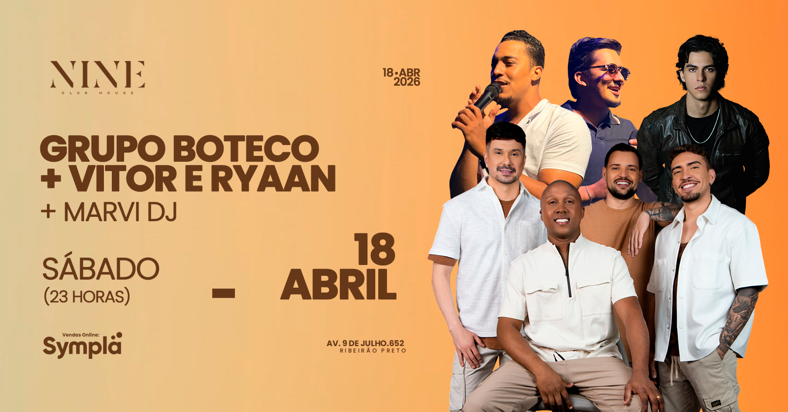 Nine Club apresenta NINE MIX com Dj Marv, sertanejo com Vitor e Ryaan e aquele pagode com Grupo Boteco. Não fique fora dessa e garanta agora o seu ingresso. Em caso de dúvidas ou reservas de lounges (16) 981719259