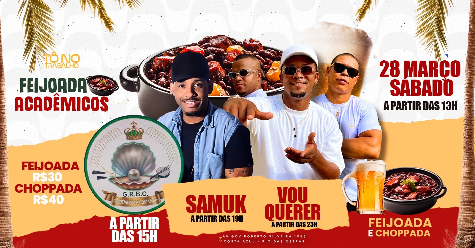 No sabado, (28MAR), é dia de você saborear a melhor feijoada de Rio das Ostras + aquele show com os Academicos de Costa Azul, Samuk e Grupo Vou Querer de Rio das Ostras! Venha curtir com a gente naquele barulhinho do mar no Pier do Costa Azul!! Chama os amigos, e garanta já o seu ingresso.