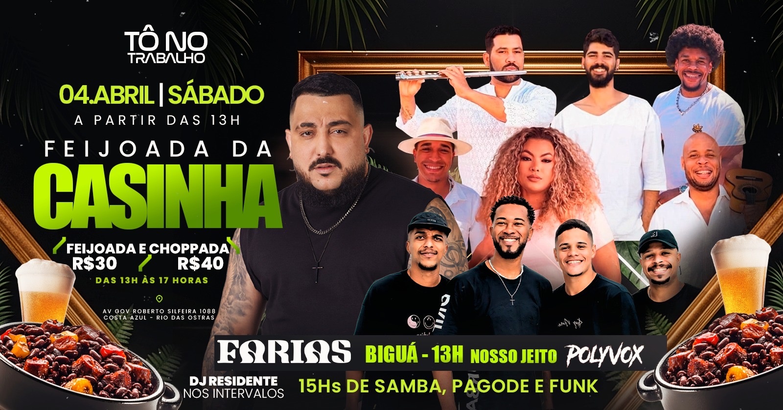 No sabado, (04ABR), é dia de você saborear a melhor feijoada de Rio das Ostras + aquele show com os diversas atrações ! Venha curtir com a gente naquele barulhinho do mar no Pier do Costa Azul!! Chama os amigos, e garanta já o seu ingresso.
