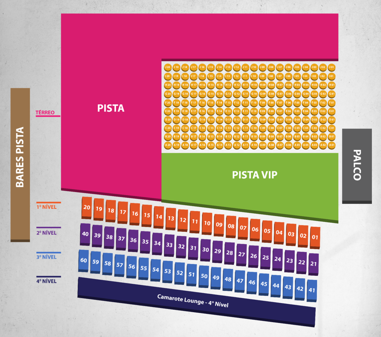 Camarote: Para 10 convidados, esse é o espaço com todo conforto e exclusividade. Contando com bares, banheiros e entradas exclusivos esse é aquele espaço para você chamar amigos ou familiares e curtir da melhor forma.