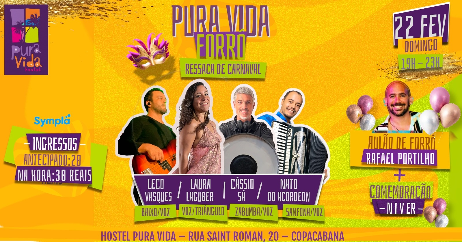 Forró dance class stats at 7 pm with Rafael Portilho and live show at 8 pm with Laura Laguber (vocals and triangle), Nandinho Barros (vocals and sanfona), Cassio Sá (vocals and zabumba) and Leco Vasques (vocals and bass), Come as you like , just come!!! This is Forró Pura Vida!!!