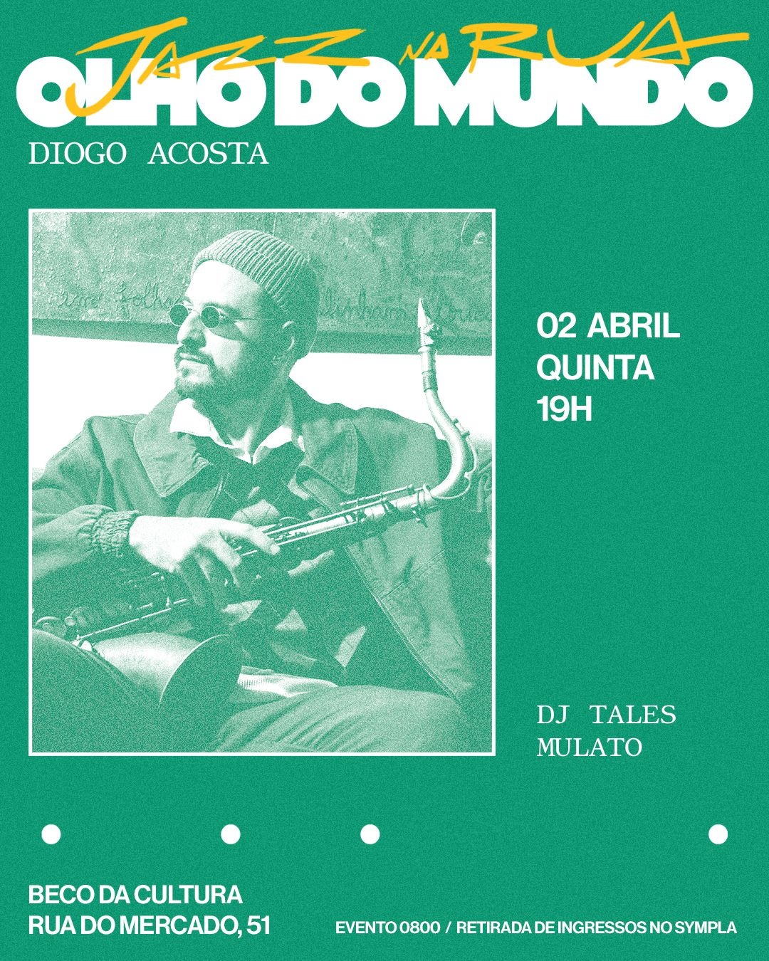 O multi-instrumentista Diogo Acosta leva ao BECO DA CULTURA o show Olho do Mundo, no dia 02/04, véspera de feriado. Projeto de musica instrumental que une diferentes partes do mundo à musica brasileira, através da linguagem do jazz contemporâneo.