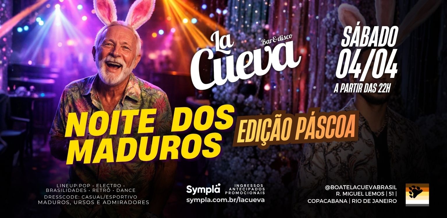 Prepare-se para uma noite inesquecível! Marque na sua agenda: QUINTA-FEIRA, 30 de Abril, VÉSPERA DE FERIADO, a partir das 22h. O BAILEDOSMADUROS tem o prazer de apresentar, nessa edição, o especial "SHAKIRA IN RIO". A pista vai bombar com os DJs:BETO RODRIGUES - ALKAY - AINDA NOSSO CONVIDADO ESPECIAL: DJ ROLIVER DIRETAMENTE DE SÃO PAULO: Trazendo os melhores VIDEOS REMIXES atuais e flash back dos anos 80, 90, 2000 e muita Shakira INGRESSOS ANTECIPADO R$ 30,00 NA PORTARIA: R$ 40,00 Até meia noite, após R$ 50,00 a noite toda. Garanta agora seu ingresso na Sympla e evite filas! Local: La Cueva - Rua Miguel Lemos, 51 - Copacabana , Rio de Janeiro - RJ