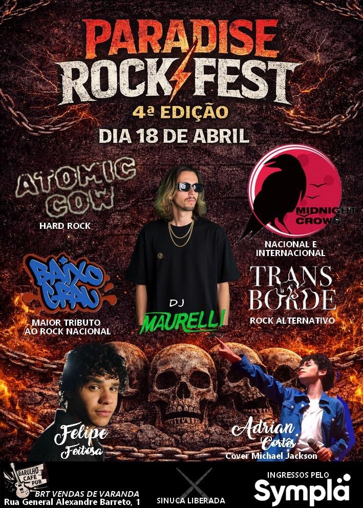 Venha Curtir e Participar com a gente do Evento mais Top da Zona Oeste. Paradise Rock Fest! O Evento que teve início em 2012, agora volta na sua 4° EDIÇÃO no mesmo Pub onde tudo começou (Barulho Café) E dessa vez conta com um Universo de Atrações (Bandas, DJ, Participações Especiais e etc...) Pensado e Dedicado Especialmente pra você, que é mais um sobrevivente, que fortalece, e que não deixa a cena morrer! Se você curte, um Mix de Música Boa, Festa, Energia Surreal, Vibe Positiva, Diversão, Rock in Roll e Muito Peso, pode ter certeza que essa galera não vai deixar faltar Nada! Venha Curtir com os Amigos esse dia Inesquecível! Vai ser Insano!