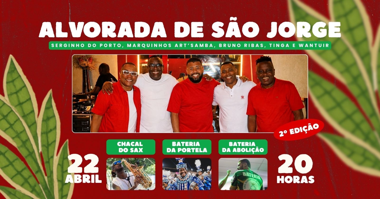 Dia 22 de abril, a noite vai ser de Alvorada de São Jorge no Terraço do Sambola Hall! A partir das 20h, se prepare para curtir muito com um show de samba e pagode comandado pelos intérpretes consagrados do Carnaval: Tinga, Marquinhos Art’Samba, Serginho do Porto, Wantuir e Bruno Ribas!