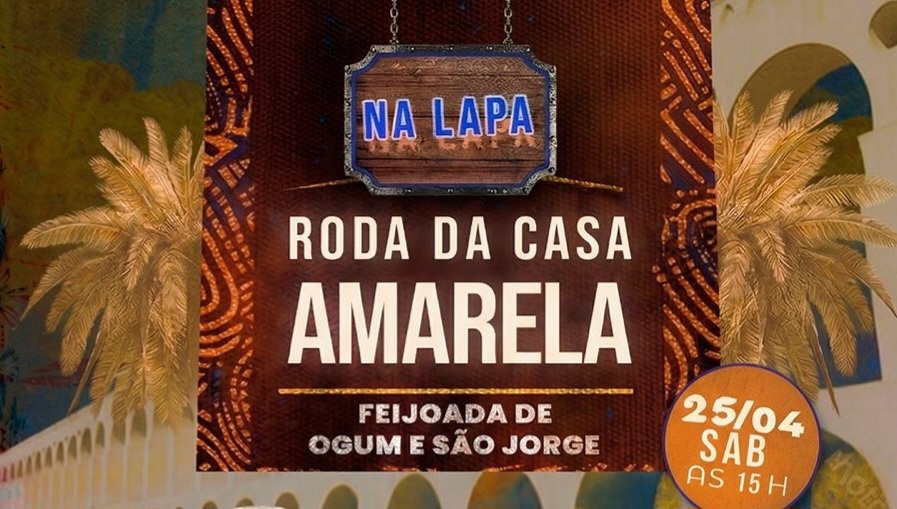 Dia 25/04 Nossa Tradicional Roda da Casa Amarela com samba de terreiro, feijoada, caipirinha, performance, cerveja, feira afro e muito axé. No coração da lapa (ao lado dos arcos). Nesta edição feijoada em comemoração a Ogum e São Jorge. Ingresso 25,00 com direito a uma cortesia de caipirinha. Reserve o seu.