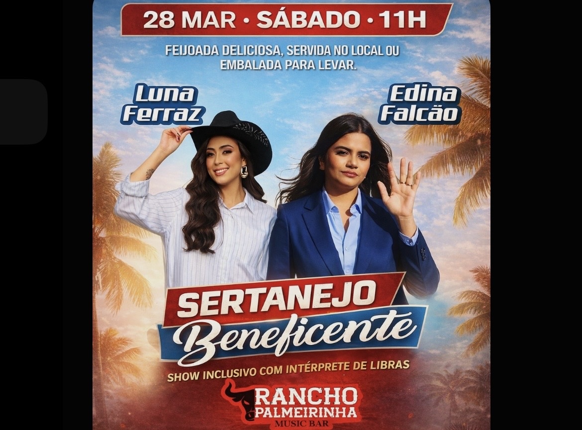 No dia 28 de março, a partir das 11h, o Rancho Palmeirinha Music Bar recebe o Sertanejo Beneficente com Luna Ferraz, um evento pensado para reunir boa música, feijoada e uma causa especial em um só lugar.