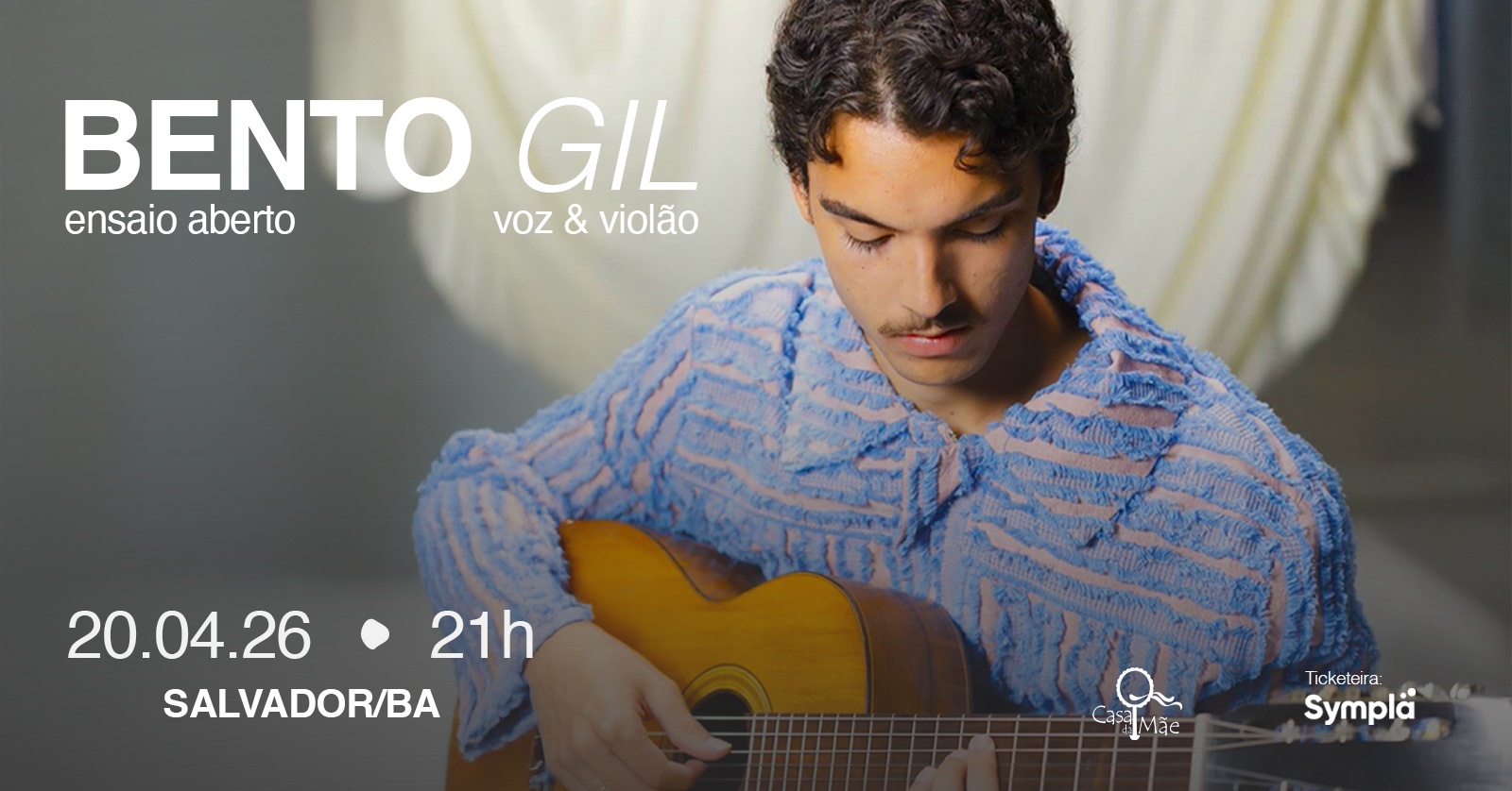 Bento Gil faz a primeira aparição pública como artista solo em um ensaio aberto, trazendo faixas inéditas de seu novo trabalho, "Silêncio Azul" além de clássicos do cancioneiro popular como "Rosa Morena" (Dorival Caymmi) e "Esotérico" (Gilberto Gil). A ideia é que seja um grande encontro com amigos, amigos de amigos e com um público interessado em conhecer novos nomes da nossa música pra um show voz & violão intimista nesse espaço que tem o carinho da família toda.