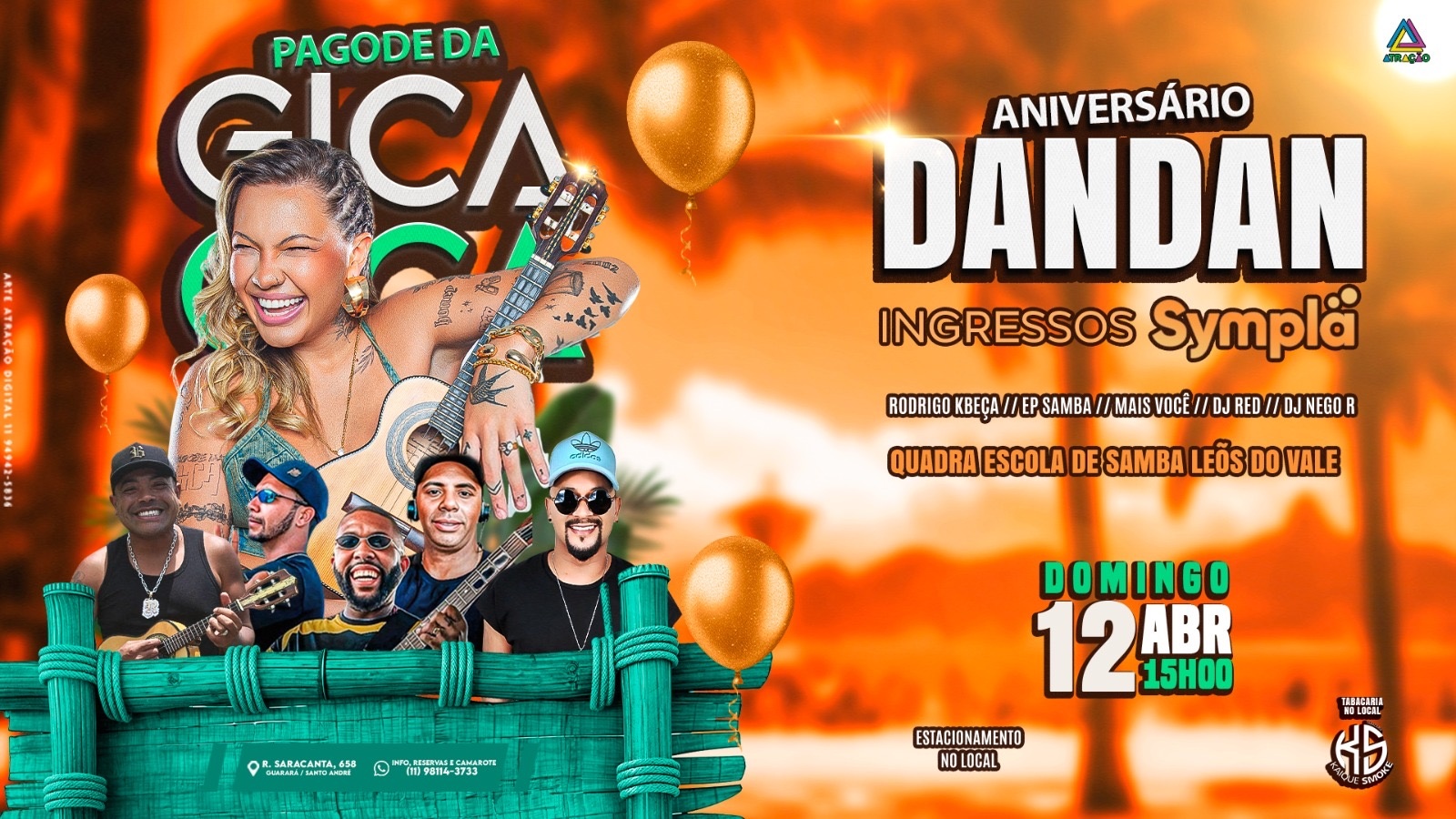 Domingo dia 12 de abril tem Pagode da Gica, Grupo Mais Você, Rodrigo Kbeça, Ep. samba, Dj Red e Dj Nego R, a partir das 15hrs na quadra da escola de samba Leões do Vale, em comemoração do aniversário do Dandan.