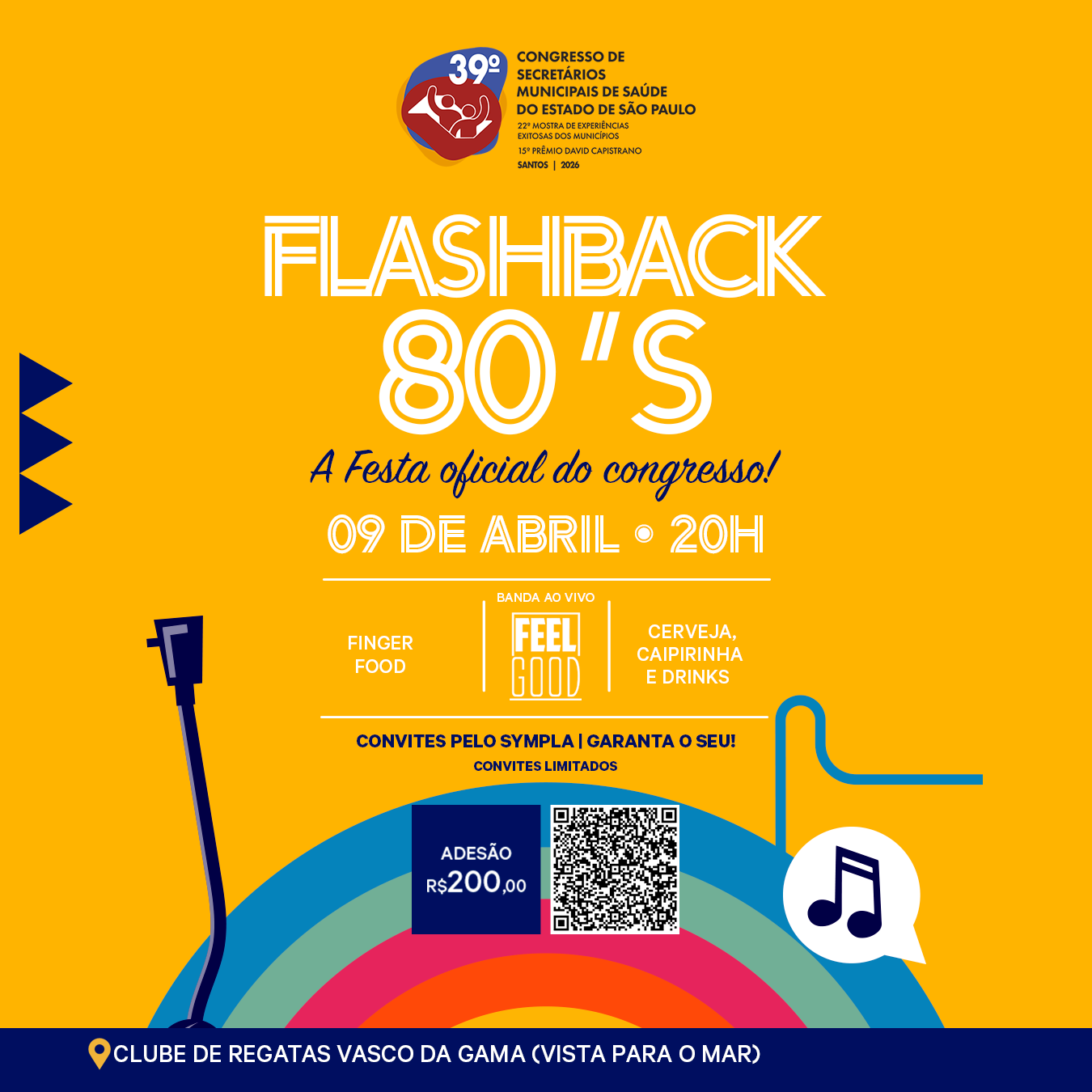 A Festa Flashback – Anos 80 é a festa oficial do 39º Congresso de Secretários Municipais de Saúde do Estado de São Paulo (COSEMS/SP) e promete reunir congressistas e convidados em um momento especial de confraternização.