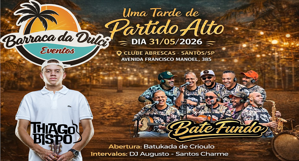 A tradição do samba raiz toma conta de Santos com a Uma Tarde de Partido Alto, um evento pensado para quem valoriza música de verdade, energia boa e aquele clima que só o samba proporciona.