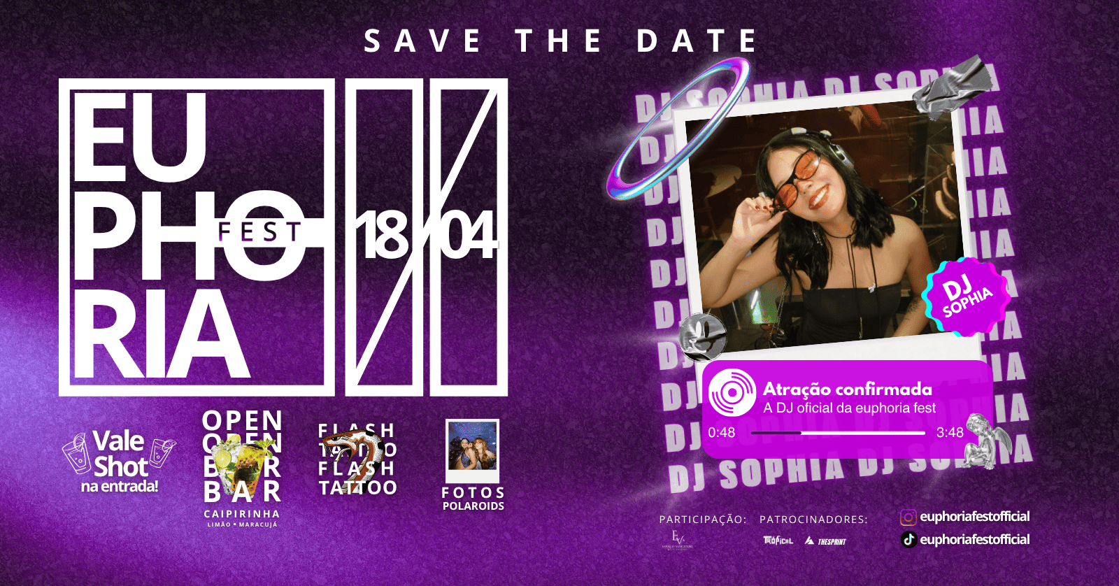 * DJ SOPHIA: A Euphoria Fest não seria completa sem uma DJ incrível. Ela vem pra comandar os graves e as batidas do que pode ser a maior noite que o Grande ABC Paulista (SBC) já viu na vida!! * Open Bar: Open de caipirinha (Limão e Maracujá) * Bar Autoral Neon: Drinks exclusivos (incluindo o nosso hit com a base perfeita do açaí Tropical). * Flash Tattoo: Artistas no local para você eternizar a noite na pele (pago à parte). Flashes exclusivos em Old School e Fine Line. (Atendimento por ordem de chegada). * Fotos Polaroid: Uma área cenográfica para o fotógrafo oficial registrar o seu look no estilo câmera analógica e câmeras polaroid!