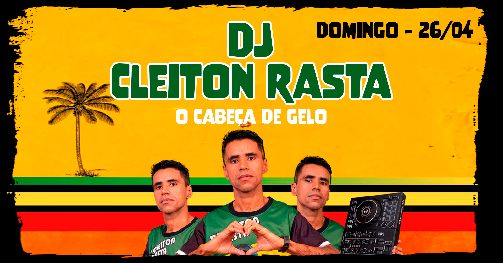 A partir das 15h DJ Sanjahmaica e quem comanda o final de tarde é ele: DJCleiton Rasta, o Cabeça de Gelo, trazendo os reggae mais pesados pra fazer todo mundo vibrar na melhor energia!