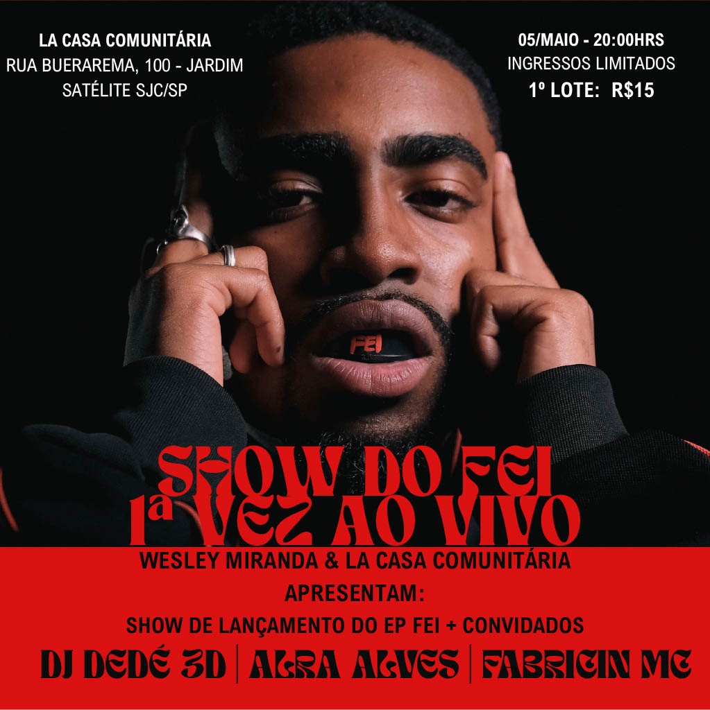 No dia 05 de maio, a La Casa Comunitária (SJC) vira cenário de um encontro diferente: Wesley Miranda apresenta o EP “FEI” ao vivo pela primeira vez em um formato mais íntimo, onde cada detalhe importa e a energia circula entre todo mundo.