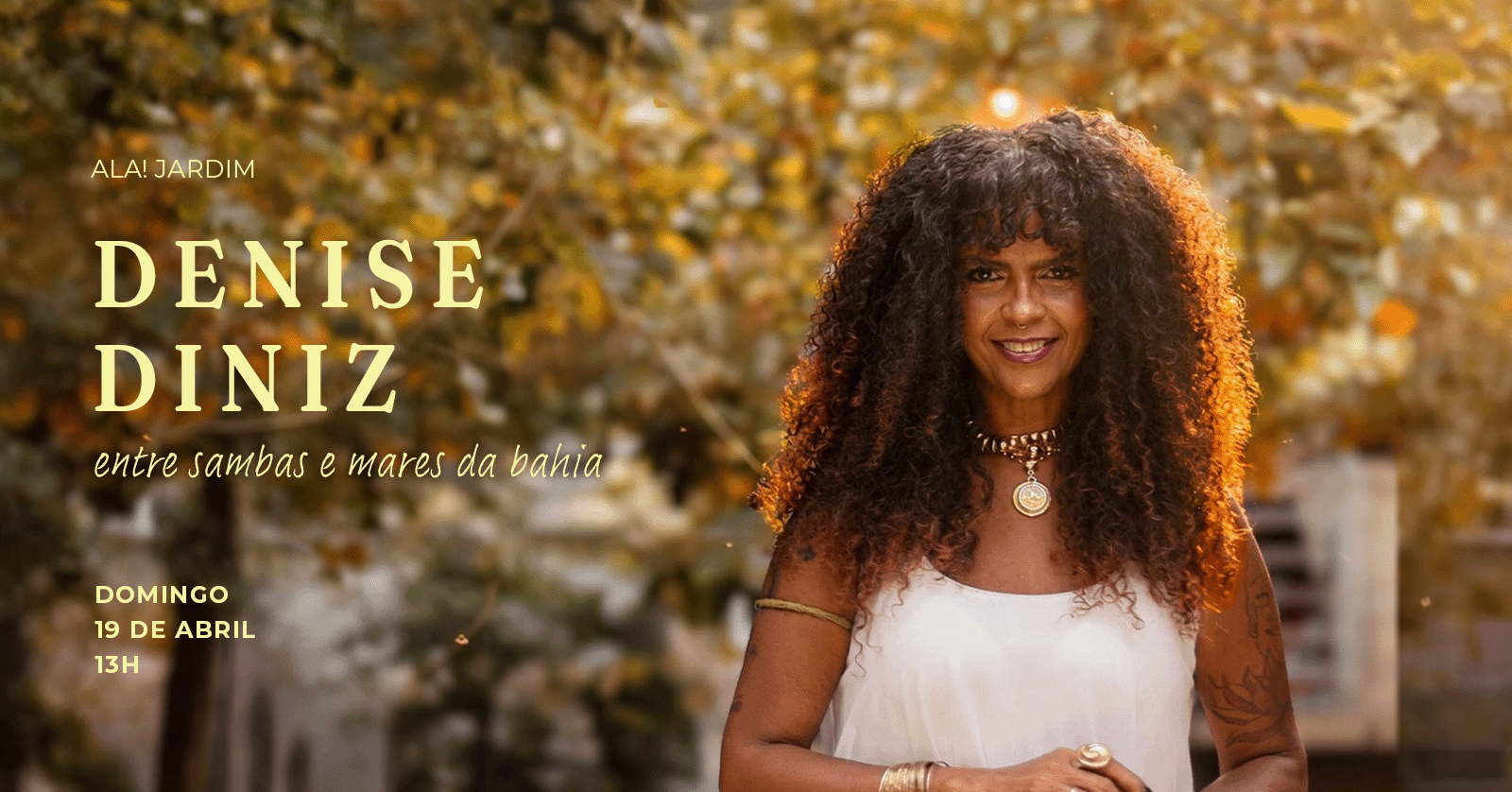 Em “Entre Sambas e Mares da Bahia”, Denise Diniz conduz o público por um repertório que nasce no Recôncavo e se espalha entre ruas, terreiros e beiras de mar. O show percorre sambas clássicos e canções que revelam a força da cultura baiana, onde o ritmo carrega memória, ancestralidade e celebração.