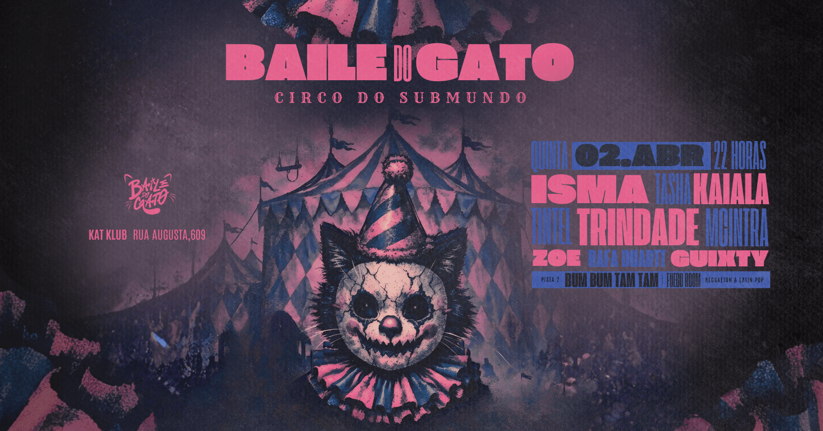 O BAILE DO GATO, seu baile funk favorito, está de volta na Kat Klub no dia 02/04, quinta-feira, em uma edição que transforma a pista em picadeiro e entrega um verdadeiro espetáculo: CIRCO DO SUBMUNDO! **>>> LINE-UP: <<<**GUIXTY