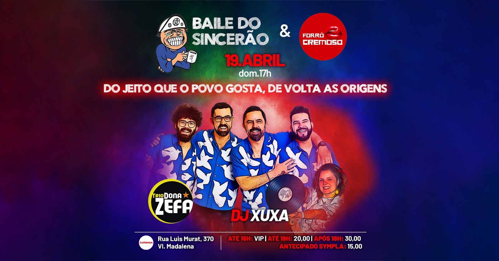Dia 19 de Abril, DOMINGO, Baile do Sincerão e Forró Cremoso, trazem TRIO DONA ZEFA e DJ XUXA .