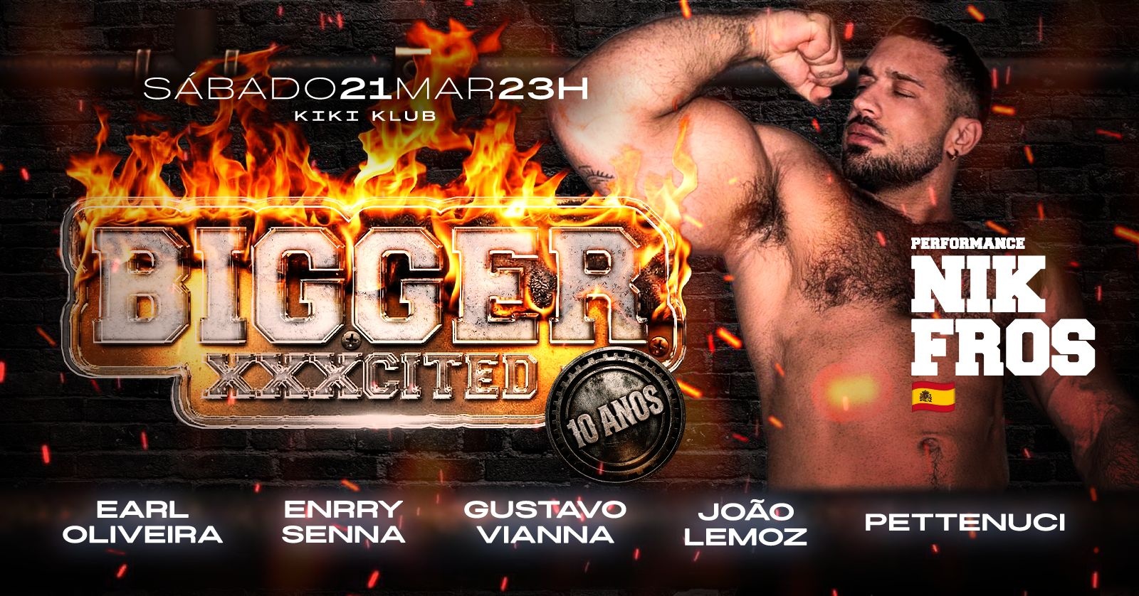 No sábado, 21 de março, a BIGGER XXXCITED retorna em uma edição especial, celebrando 10 Anoscom o porn-star Nik Fros (Espanha), além de atores nacionais e strippers.