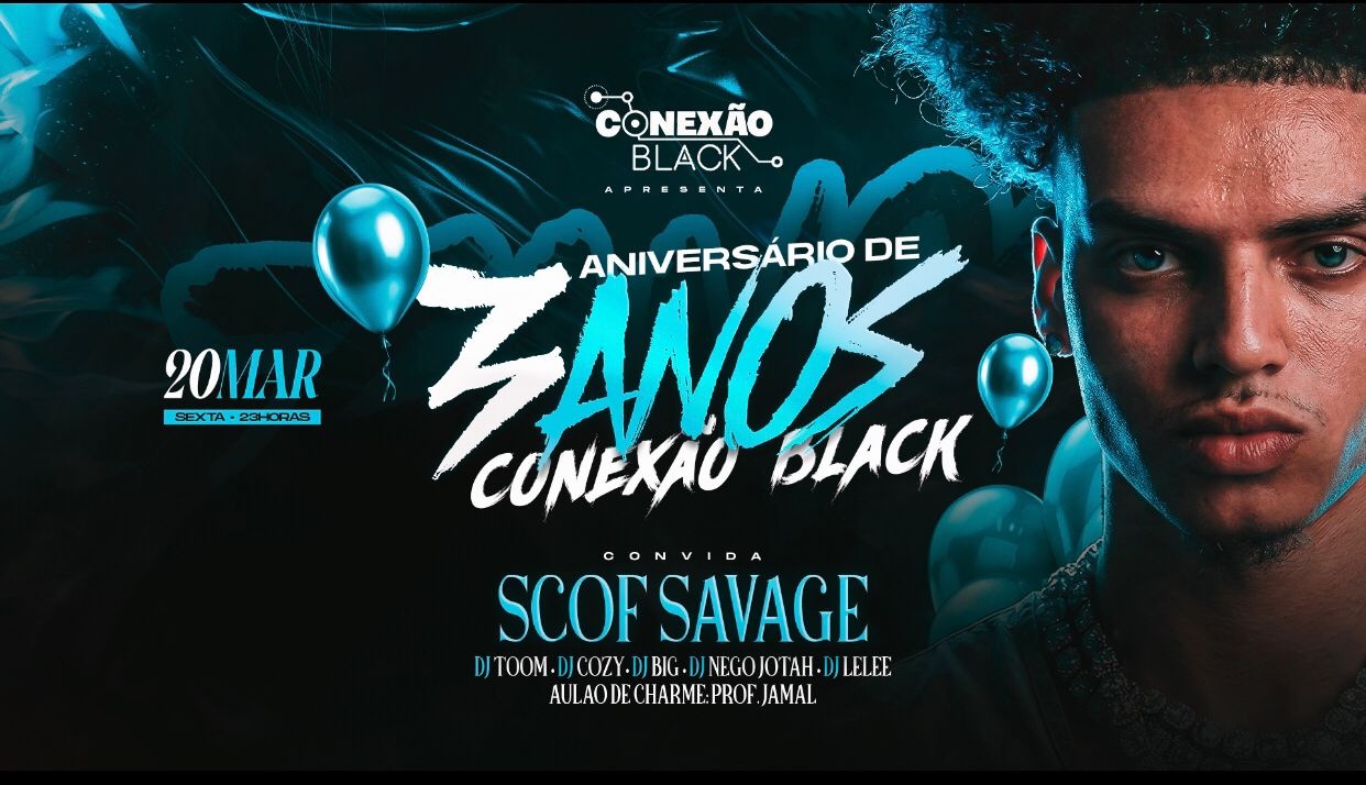 *Vem ai Edição Especial "3 ANOS DE CONEXÃO BLACK convida SCOF SAVAGE"**,**amantes da Black music e Dancehall, se preparem para uma verdadeira conexão de verdade, Venha comemorar nosso aniversário com uma line recheada Deejay's + Aulão + Pocket show.*Será uma noite inesquecível no centro de são paulo. Nos vemos lá!