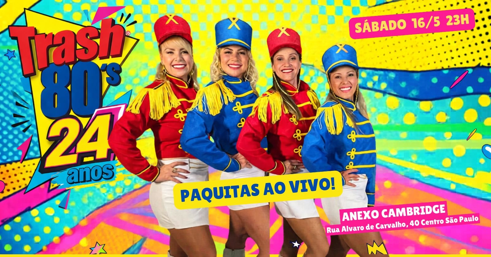 A Trash 80’s chega aos 24 anos de história e comemora em grande estilo. No dia 16 de maio, a festa recebe quatro ex-Paquitas da Xuxa para uma noite memorável e exclusiva — com ingressos limitados.