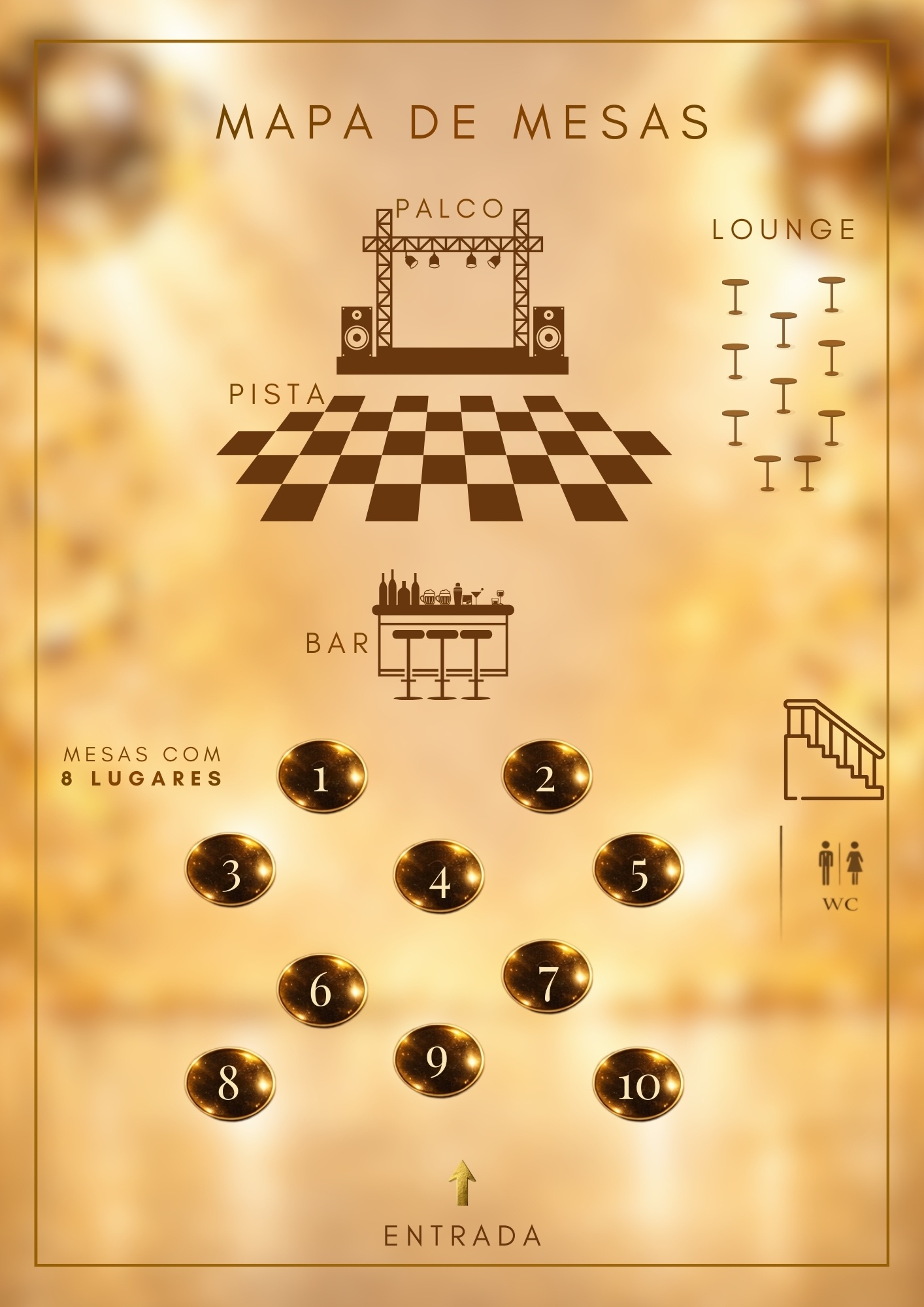 Após a compra do ingresso na modalidade Mesa, é necessário entrar em contato pelo WhatsApp (11) 98637-0267 para realizar a escolha da mesa, conforme disponibilidade.