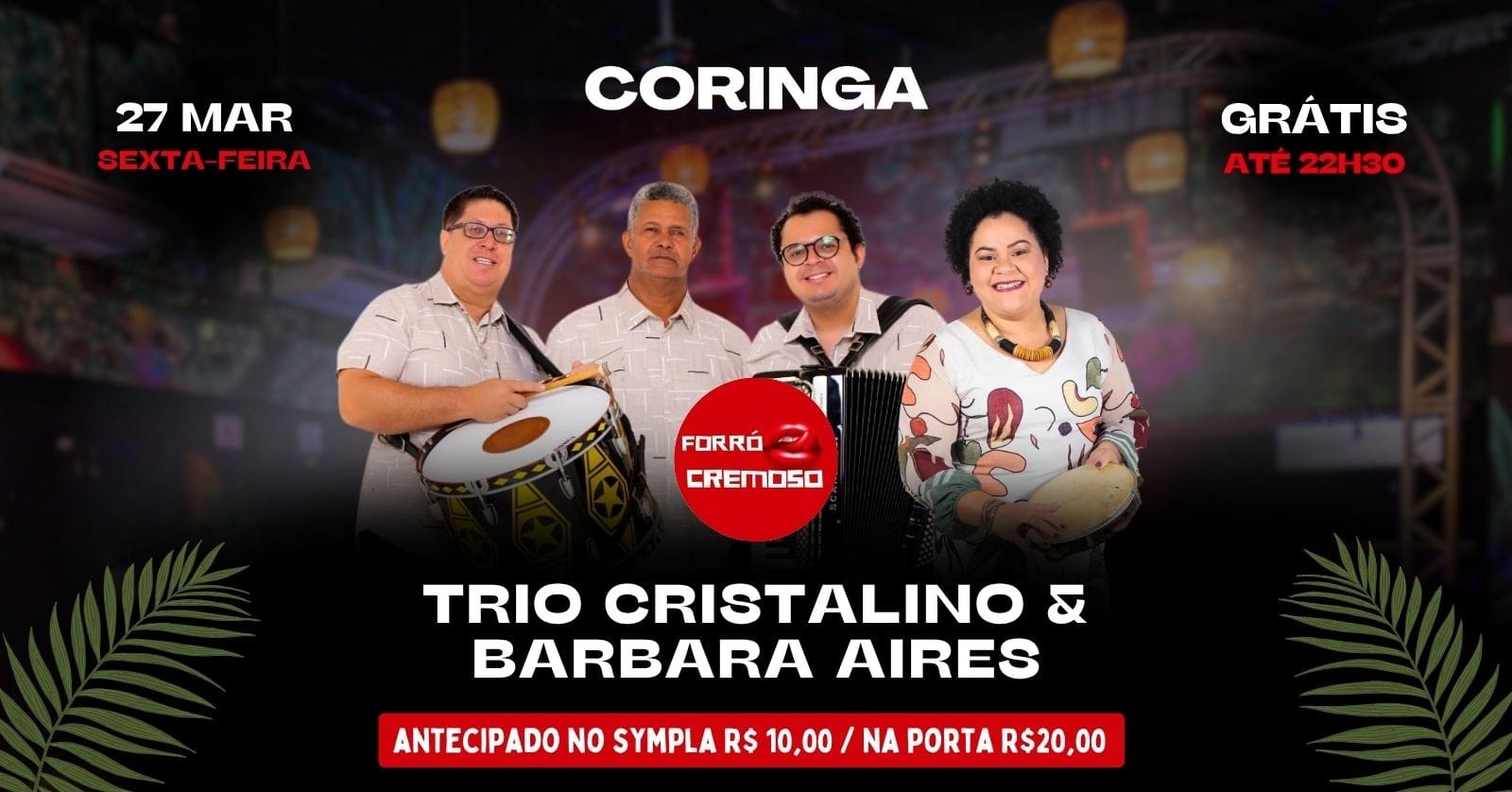 Dia 27 de Março, SEXTA, o Forró Cremoso, traz nossos queridos TRIO CRISTALINO E BARBARA AIRES para mais uma noite Inesquecível.
