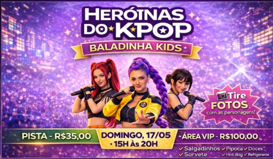 O evento Heroínas do K-pop – Baladinha Kids chega para encantar crianças e famílias com um espetáculo vibrante inspirado no universo do K-pop.