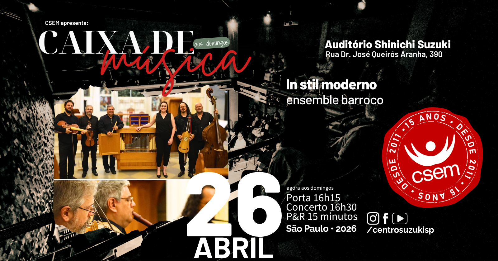 A CAIXA DE MÚSICA começa no domingo 26/04 com um concerto da ensemble barroco In Stil Moderno, grupo de Campinas. Em Agosto, teremos um concerto com o spalla da OSESP Emanuelle Baldini e seus amigos. Setembro é a vez de ouvirmos uma combinação interessante e inusitada: violão e piano, com o duo Lucatelli Bartoloni. Em Novembro, teremos o privilégio de prestigiar um grande nome internacional, com o flautista Michael Form e o cravista Dirk Börner e um convidado especial Rafael Augusto no fagote barroco, um concerto imperdível.