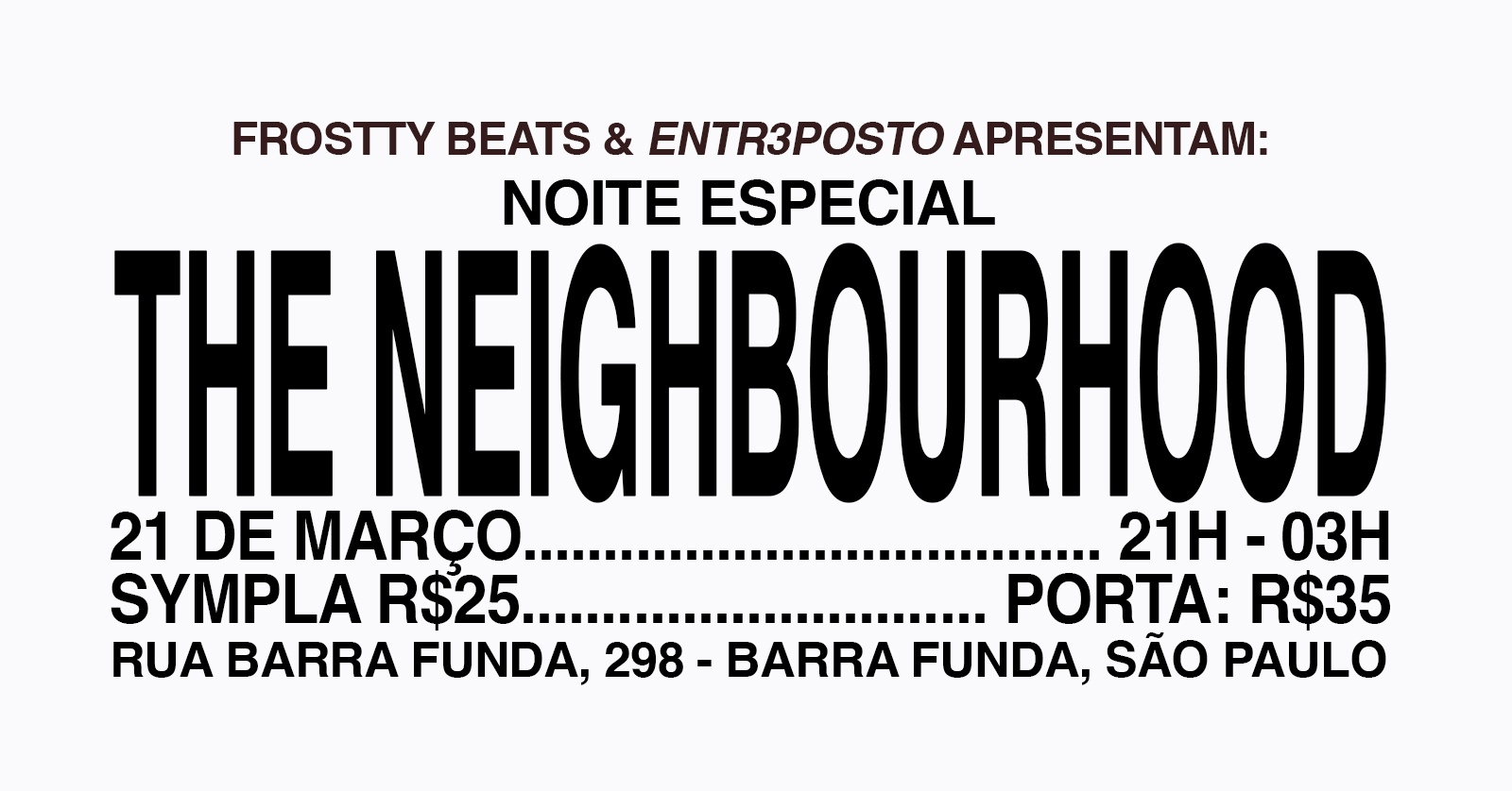 No dia 21 de março (sábado), acontecerá a NOITE ESPECIAL THE NEIGHBOURHOOD, um rolê que irá das 21h00 às 03h00 com um set composto de hip-hop e indie, junto com um set exclusivo com mais de 2h00 de músicas do The Neighbourhood. Tudo isso, apresentado pelo DJ Frostty Beats.