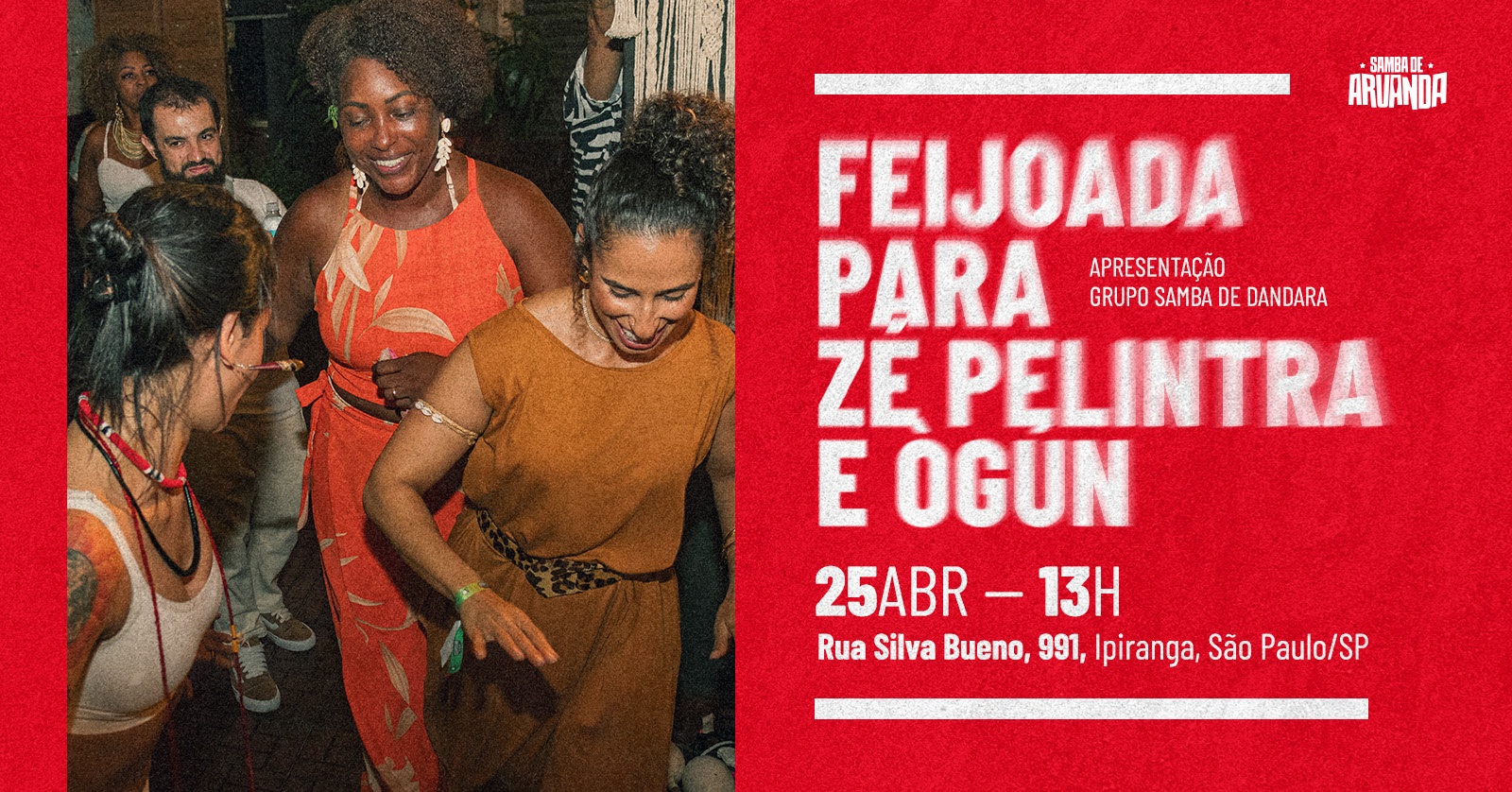 Desta vez, o samba fica por conta do grupo Samba de Dandara, com um repertório alinhado à magia cantada de nosso congá. Entre palmas, tambores, dança e celebração da cultura afro-brasileira, nosso ajeum será preparado pelas mãos de nossas Oyás e Yemanjás, que colocam saber e sabor na mais famosa feijoada da comunidade!