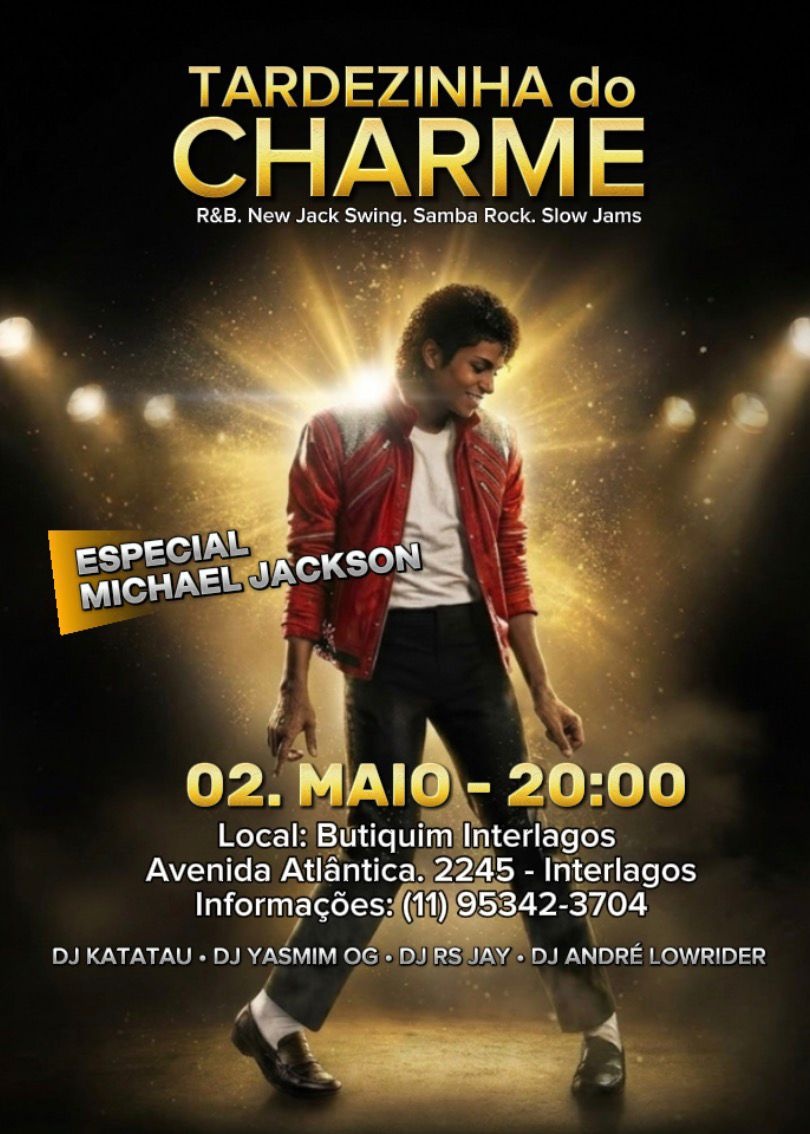 Prepare-se para uma noite inesquecível no Especial Michael Jackson – Baile Tardezinha do Charme. Uma experiência perfeita para quem ama dançar, sentir a vibe da Black Music e reviver a energia que marcou gerações.