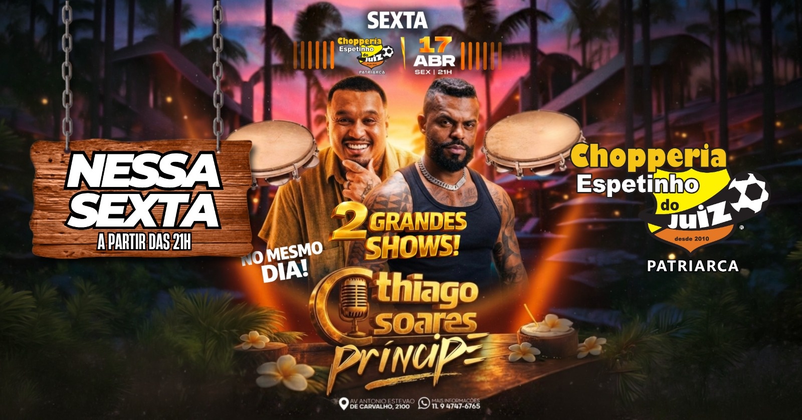 Thiago Soares, um dos grandes nomes do pagode nacional, e PRÍNCIPE, trazendo aquele pagode envolvente que a galera já vem cantando junto.Com ambiente climatizado, área externa e aquele clima de resenha que só o Juiz sabe fazer, essa é a pedida perfeita pra reunir a galera e curtir um pagodinho de respeito!