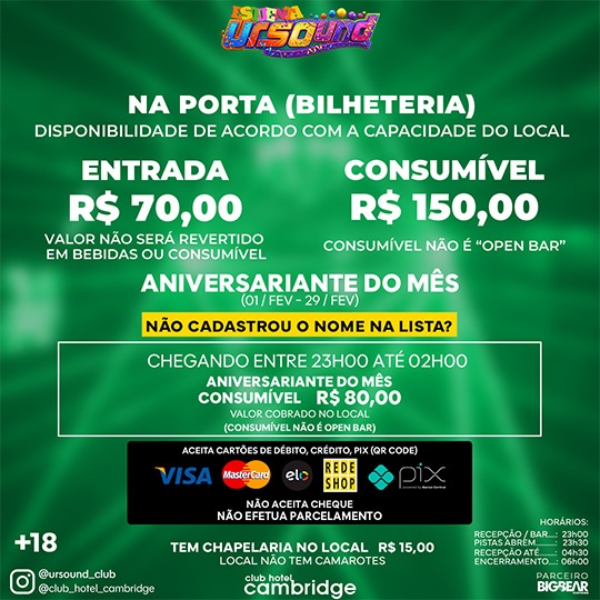 URSOUND - SÁBADO, 07 de Fevereirode 2026, a partir das 23h no Club Hotel Cambridge