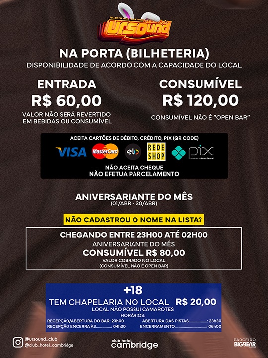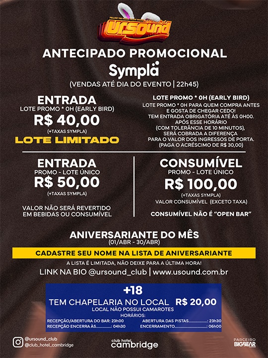 URSOUND - SEXTA, 03 de Abrilde 2026, a partir das 23h no Club Hotel Cambridge