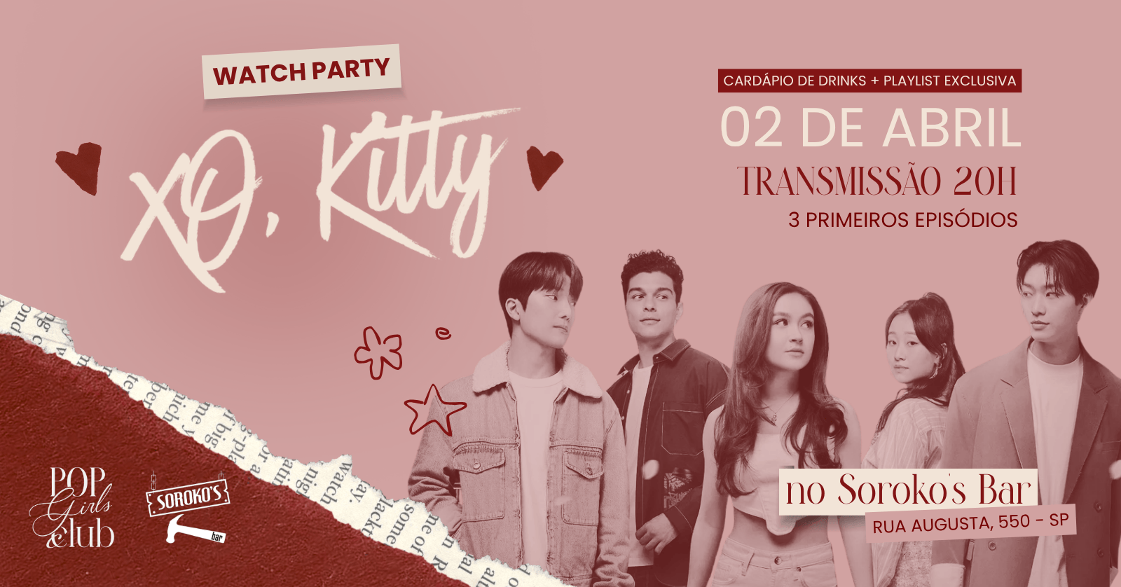 no dia 02 de abril, o pop girls club te convida pra uma watch party de XO, Kitty no Soroko's Bar!