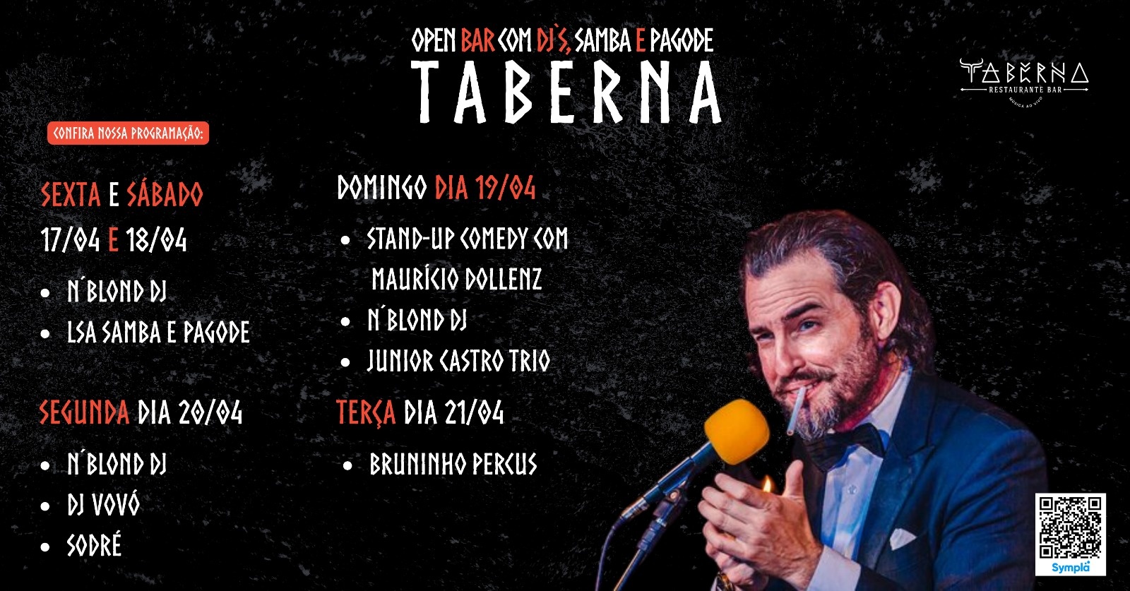 Uma Noite no Castelo:Standup Comedy com Mauricio Dollenz ( Coringa ) Pop Rock com Junior Castro+ a DJ N,Blond + Open Bar O Taberna convida você para uma noite onde o mistério de um castelo medieval com tendência gótica . Com uma arquitetura imponente de dois andares. O evento oferece desde ambientes imersivos até uma Zona VIP exclusiva e uma sacada (balcão) com vista privilegiada. O PONTO ALTO: OPEN BAR Não chegue tarde! A celebração começa com tudo. OPEN BAR: Das 19:00h às 21:00h. Aproveite nossas bebidas selecionadas enquanto desbrava cada canto do castelo e se prepara para o melhor do pagode. LINE-UP & CRONOGRAMA 18:00h | OPENING: A Dj N´Blond (Electronic Immersive) Iniciamos pontualmente às 17h para o pôr do sol no castelo. apresenta um set que combina natureza e inovação, criando uma jornada sonora imersiva. É a trilha sonora perfeita para explorar os dois andares e a sacada do Taberna sob a luz do entardecer. 20:30h | MAIN SHOW: Standup Comedy com Mauricio Dollenz 22hs | Junior Castro : trazendo um som de alta qualidade no estilo pop rock e brasilidades com a energia no alto. O CENÁRIO: TABERNA Viva a experiência de festejar em um verdadeiro castelo: Arquitetura Gótica: Um ambiente instagramável e único. Dois Andares: Diferentes atmosferas para você curtir. Zona VIP: Conforto e exclusividade para quem busca o melhor. Sacada: O lugar ideal para respirar o ar da noite e ver a festa de outro ângulo. INFORMAÇÕES GERAIS: Data: Domingo 19 de Abril. Abertura dos Portões: 18:00h Início do Open Bar: 19:00h e Dj N'Blond Show: Standup Comedy + Pop Rock 21:00h Local: Taberna - Rua Sebastião Romão César, 407 — Maresias (Perto do Beco da Mulher-Maravilha) Realização: Taberna Os ingressos são limitados e o castelo tem capacidade restrita. Garanta seu lugar agora pelo Sympla e não fique de fora dessa noite histórica! Te esperamos no Taberna para abrir a noite com estilo, mistério e muito samba no pé!
