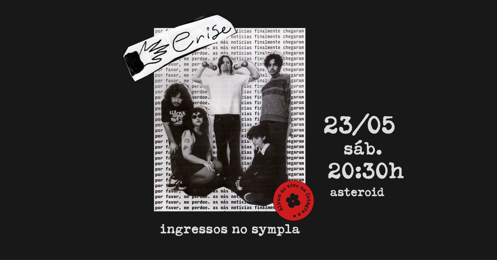 << A banda sorocabana, Crise apresenta seu álbum de estreia "por favor, me perdoe, as más notícias chegaram", um retrato sobre a ansiedade atual que atravessa o indie rock, o dream pop e o shoegaze, com camadas de guitarra, sintetizadores e uma dinâmica construída coletivamente pelos cinco integrantes da banda. O álbum será apresentado ao vivo na integra pela primeira vez, e marca o momento mais maduro de um grupo que vem ocupando os palcos da cena independente paulista >>