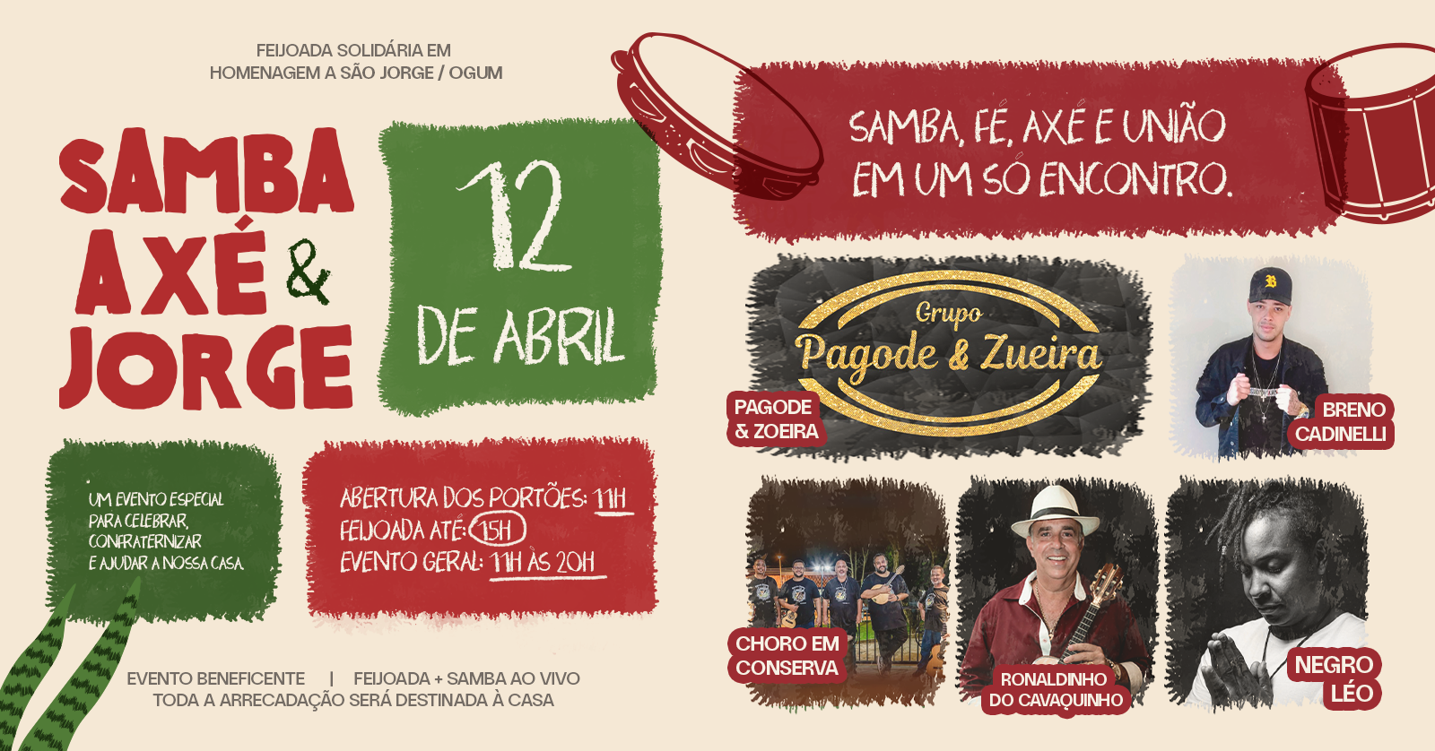 No dia 12 de abril de 2026, a partir das 11h, acontece o Samba, Axé e Jorge, um evento criado para celebrar sob a proteção de São Jorge / Ogum, reunindo boa música, energia positiva e um propósito maior.