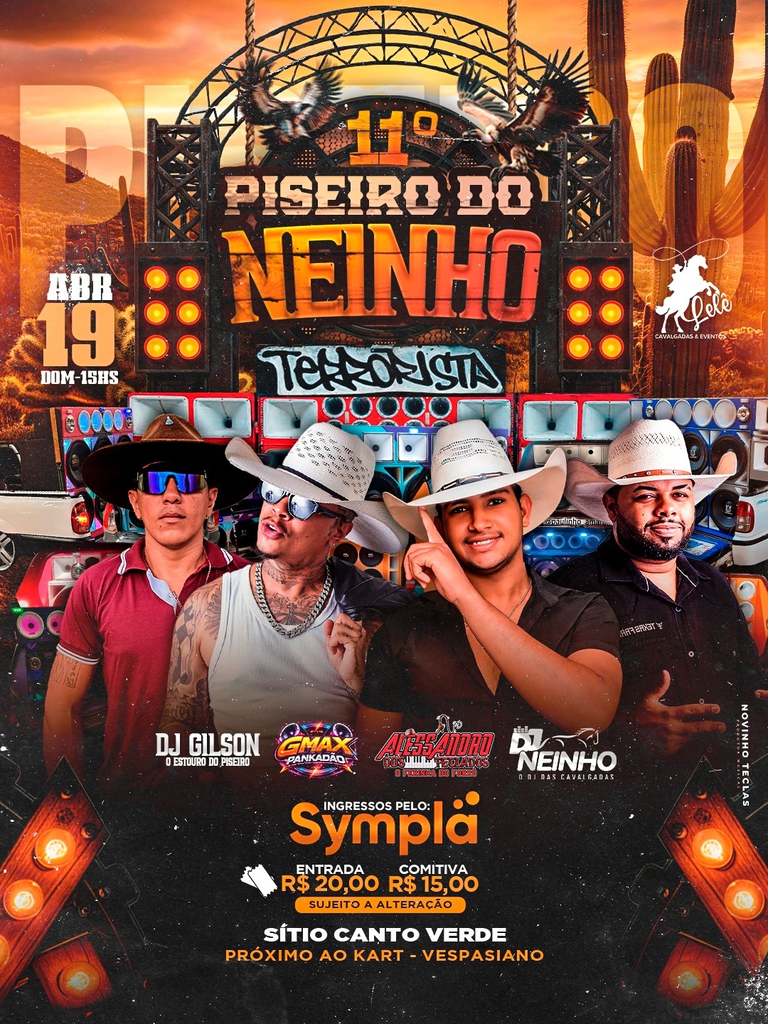 "Prepare-se para o 11º Piseiro do Neinho! No dia 19 de abril, a partir das 15h, no Sítio Canto Verde, próximo ao Kart, em Vespasiano. Uma tarde imperdível com os maiores nomes do piseiro: DJ Gilson, Gmax Pankadão, Alessandro dos Teclados e DJ Neinho, o DJ das Cavalgadas. Ingressos pelo Sympla: entrada R$20,00, comitiva R$15,00, sujeito a alteração. Não perca essa experiência única!"